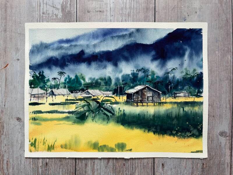 Oubliez et fuyez un instant l’effervescence de la rentrée pour faire le plein de sérénité avec ce paysage de rizières au Vietnam. Ce sujet propose de travailler à la fois dans l’humide et dans le sec pour suggérer certains éléments naturels et détailler l’architecture traditionnelle de ces maisons à pilotis.