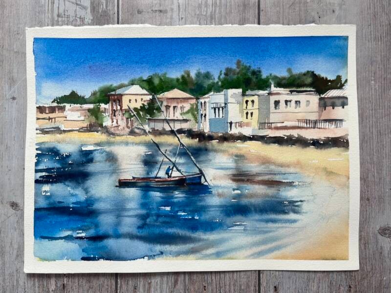 Vif soleil d’Afrique Australe sur les façades d’un village de pecheurs au bord de l’Océan Indien. Ce sujet est l’occasion de travailler la lumière des reflets sur l’eau et de comprendre comment aller à l’essentiel sur la partie architecturale de la composition.