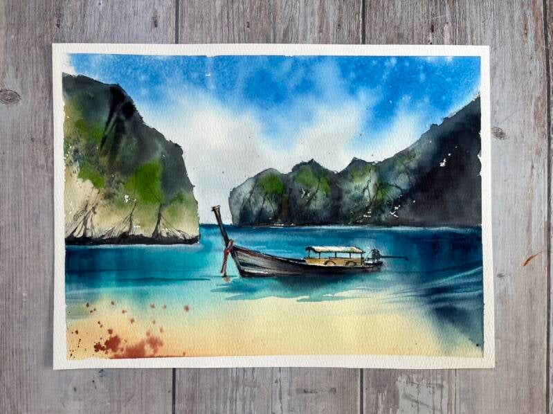 Ce premier sujet est une invitation à l’exotisme sur une plage tropicale de Thailande. Ce cours commence en douceur par un sujet qui permettra de comprendre comment simplifier certains éléments de la composition pour mieux se focaliser sur d’autres. Chaleur, soleil et bleu des mers du sud sont au programme.